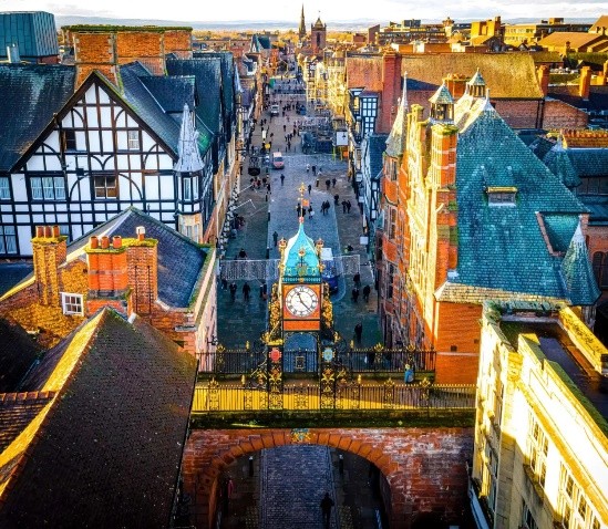街全体が城壁に囲まれており、チューダー様式の建物が並ぶ景色には 重要文化財建物に登録されている『ザ・ロウズ』や『イーストゲート時計台』などの見どころや、美しい橋の架かるディー川沿いの城壁を散歩したり、地元のビールやエールを試すことができるさまざまなパブを訪れたりと、見どころが徒歩圏内にギュッとつまった都市を満喫ください。