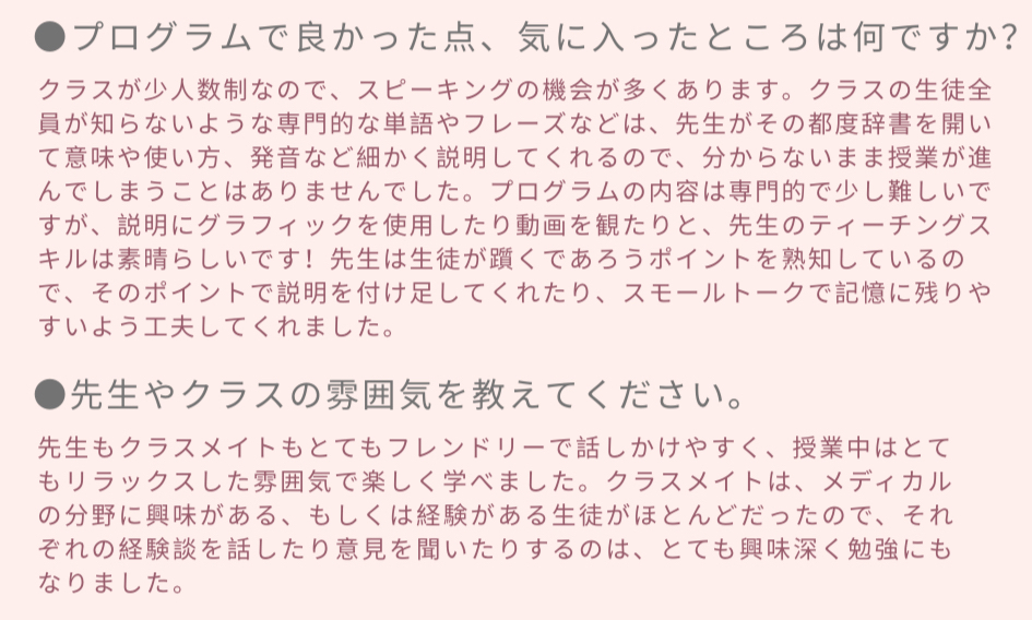 | レベル分け | 医療英語クラスは1クラスのみの開講 | 通学方法 | 公共交通機関(バス・地下鉄・路面電車) |