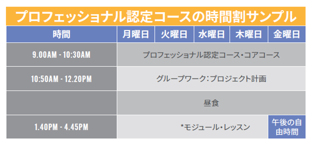 プロフェッショナルサティフィケートコースは、2週間のモジュールで組まれており、2週間または4週間受講する事ができます。