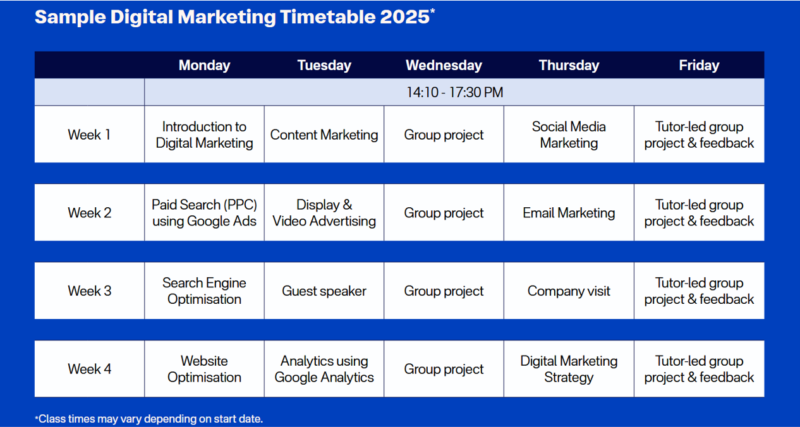 大学生/社会人向け、デジタルマーケティング4週間+英語コース2週間から期間を選べるコースです。今企業が求める人材は業種に関わらずデジタルマーケティングの知識が欠かせません。 このコースには、企業や店舗訪問、業界で働く現役のゲストスピーカーからのレクチャー、グループワークやプレゼンなどの実践的な内容も含まれています。ワーホリでロンドン滞在中に仕事に活かせるスキルを身に着けてみませんか?