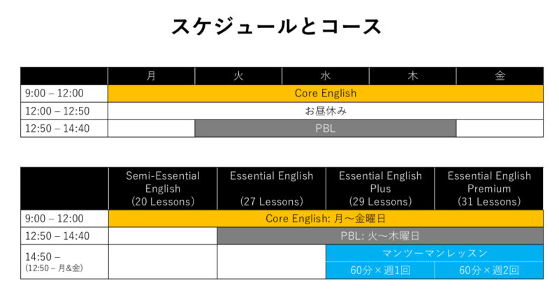 Essential English プログラム 27 lesson:平日 9:00am-14:40pm 金曜日のみ9:00am-12:00pm