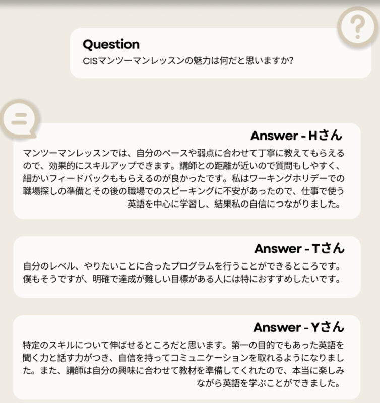 マンツーマンレッスンでは面接対策/英語プレゼン練習/発音矯正/専門分野の英語強化など自分の学びたいことを完全にカスタマイズできます。担当講師と1対1で向き合うことで、自分に本当に必要なスキルだけを集中的に学べるため、初心者も上級者も、自分のペース・目的に合わせて無理なくステップアップができます。