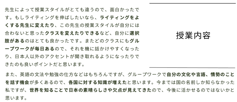 有料提供されている大人気の就職ワークショップが含まれる特別コース。履歴書・カバーレターの添削、模擬面接に加え、接客英語や仕事探しのノウハウを実践的に学べます。さらに週替わりのオンラインワークショップも用意されているため、忙しい方でも無理なく参加できるのが大きな魅力です。