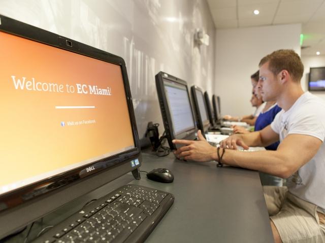 - ECマイアミ校は、マイアミ・サウスビーチのランドマークともなっているビル内に位置。リンカーンロードのショップやレストラン、オープンカフェやバーなどに囲まれ、またアメリカのビーチを象徴する白い白浜にクリスタルブルーの海の、歩いてすぐそこです。